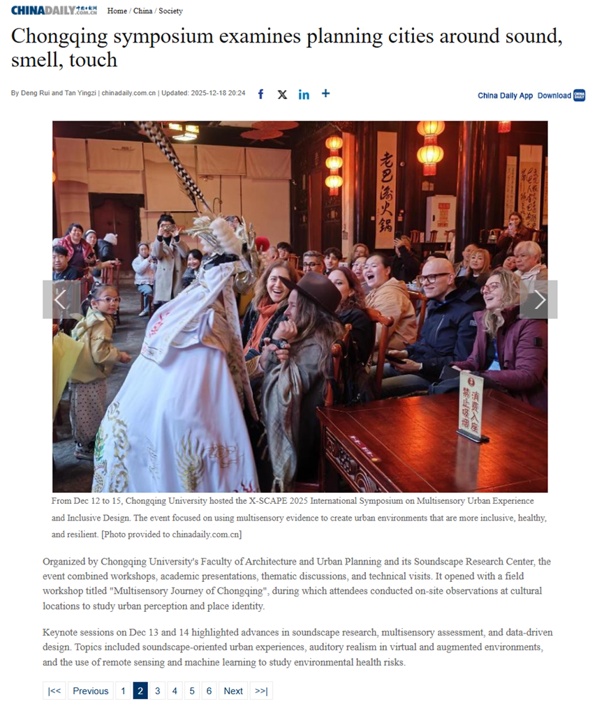 2025年12月12日至15日,由重庆大学建筑城规学院、重庆大学声景研究中心谢辉教授团队主办的多感官城市体验与包容性设计国际研讨会(The International Symposium on Multisensory Urban Experience andInclusive Design)成功举行。会议成果受到广泛关注,中国日报(CHINA...