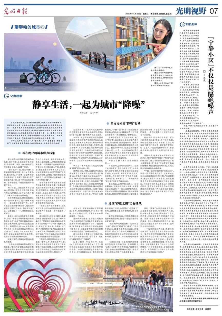 近日,《光明日报》在“聊聊咱的城市”报道中,对重庆大学声景研究中心主任谢辉教授进行了专题采访,聚焦现代城市的声环境议题。 在城市繁荣发展、活力绽放的同时,宁静正成为一种稀缺品。商家促销的喧嚣、工地施工的嘈杂、汽车加速的轰鸣、邻居装修的敲打……生态环境部公布的数据显示,2024年全国生态环境投诉...