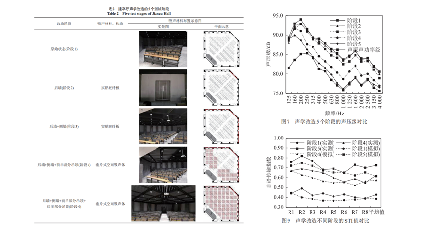 目前我国有大量报告厅面临声学改造,而吸声材料的不同布置位置会对室内音质造成较大影响。文章以重庆大学建卒厅为例,对5个声学改造阶段的室内混响时间、声压级、语言传输指数进行了模拟与实测,研究了吸声材料的布放位置对报告厅内声场分布特征及大厅典型声学参数的影响。在该报告厅内,相同吸声材料布放在吊顶的不同区域,模拟的中频混响时间下降值可相差13.8%。在侧墙安装吸声材料后,各接收点声压级衰减的最大差值可达3.2 dB(A),且语言清晰度受混响时间与早期反射声的影响较大。未来报告厅的声学设计应优化吸声材料的布放位置,合理控制声场不均匀度。