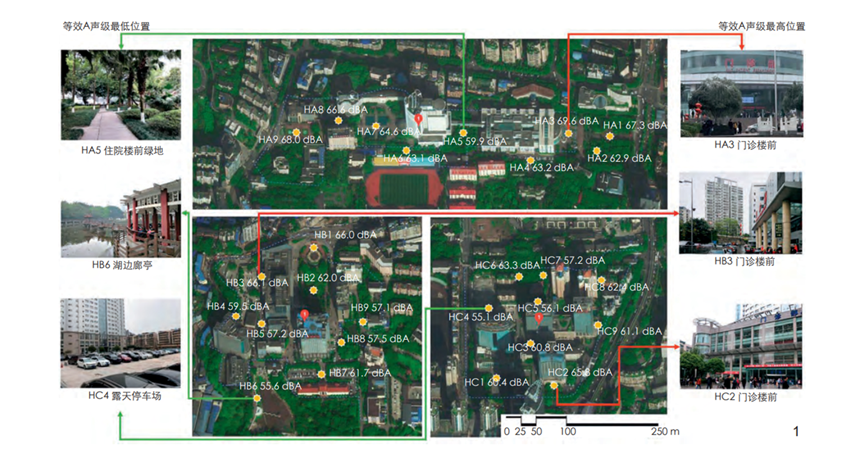 以提升医院室外空间声景品质,为未来医养环境与康复景观设计提供基础数据支撑与科学参考为目标,采用声漫步方法对大型综合医院室外空间声景进行评价,重点分析案例医院室外空间的声环境与声景感知特征。研究发现:医院室外空间平均噪声值比标准限值高出5.2~10.4 dB(A);各医院门诊大楼附近室外空间受道路交通噪声和交谈声影响较大,其噪声值比医院室外空间平均噪声值高出4.2~5.8 dB(A);“近处有自然声,远处有人为声”被认为是医院室外空间的声期待特征;等效A声级与声景舒适度、声景自然度、视听协调度呈显著负相关。从低频噪声控制、动态静态交通优化、声掩蔽、自然声强化、视觉景观优化等方面,提出了医院室外空间的声环境控制与声景优化建议。本研究证实了同步声漫步声景评价的有效性,并可从声景营造视角为医院康复景观的深入发展提供支持。