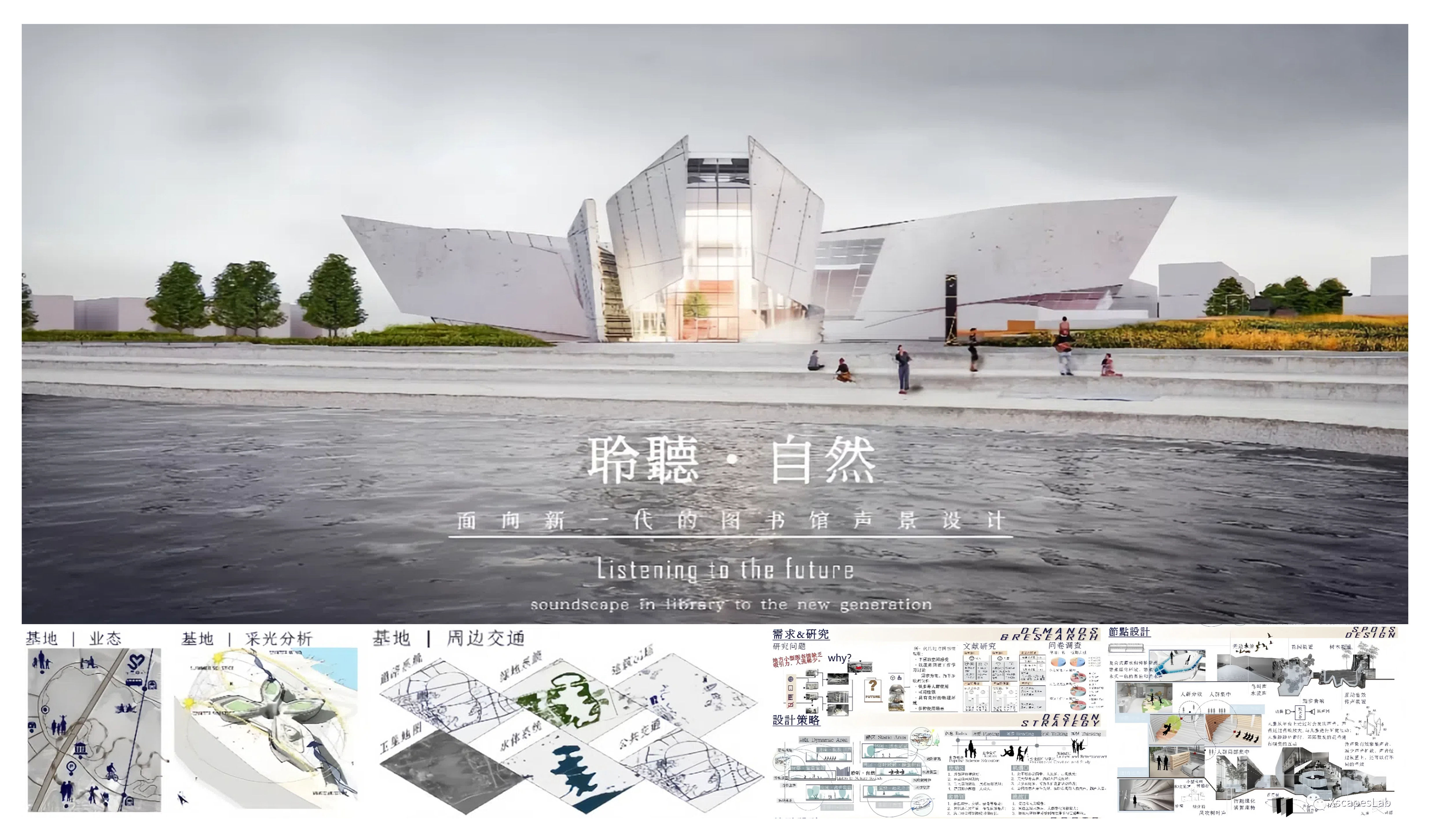 日新月异的科技发展使得现代图书馆在建筑形式、功能、阅读方式等方面都发生了翻天覆地的变化,从而让使用者对图书馆声环境的要求也发生了变化。本作品基于现代图书馆不同阅读场景的使用需求,结合场地周围自然景观优势,在不同阅读空间中加入视觉、听觉、触觉等多感官体验设计,希望读者能在阅读、交流、休息、冥想时享受学习的乐趣、体验自然场景。