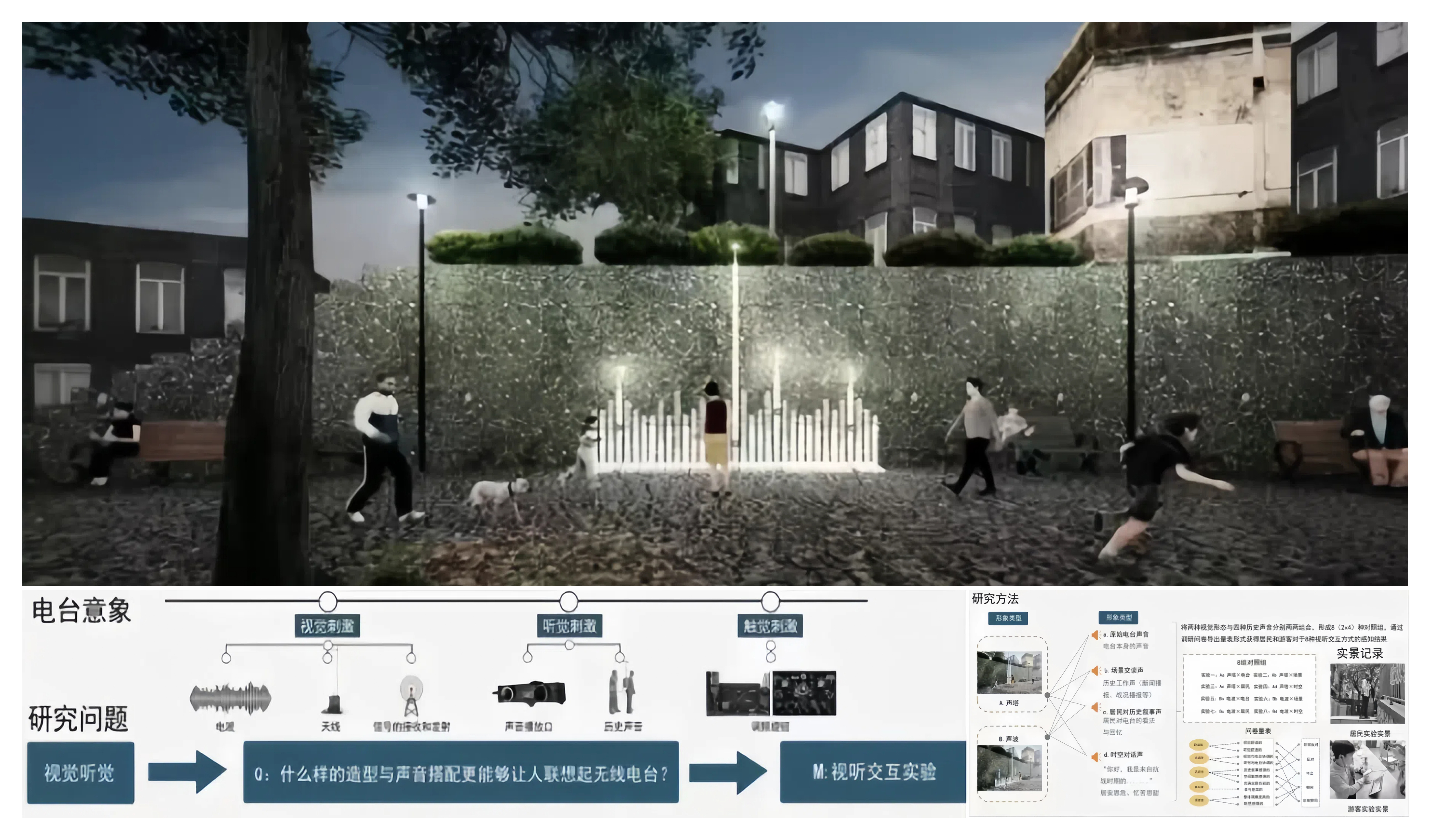 设计基地为无线电台遗址,装置以“纪念碑式”电台为灵感,置入声波、天线、灯球等符号,模拟信号传出接收过程:打开声音播放旋钮,可根据旋转角度控制播放3种历史声音类型,灯球亮起,荧光小球被吹起,形成一颗颗跳跃的音符,夜晚则像萤火虫闪闪飞起。装置采用PVC管、太阳能灯球等低碳材料展开易变化的模块设计。