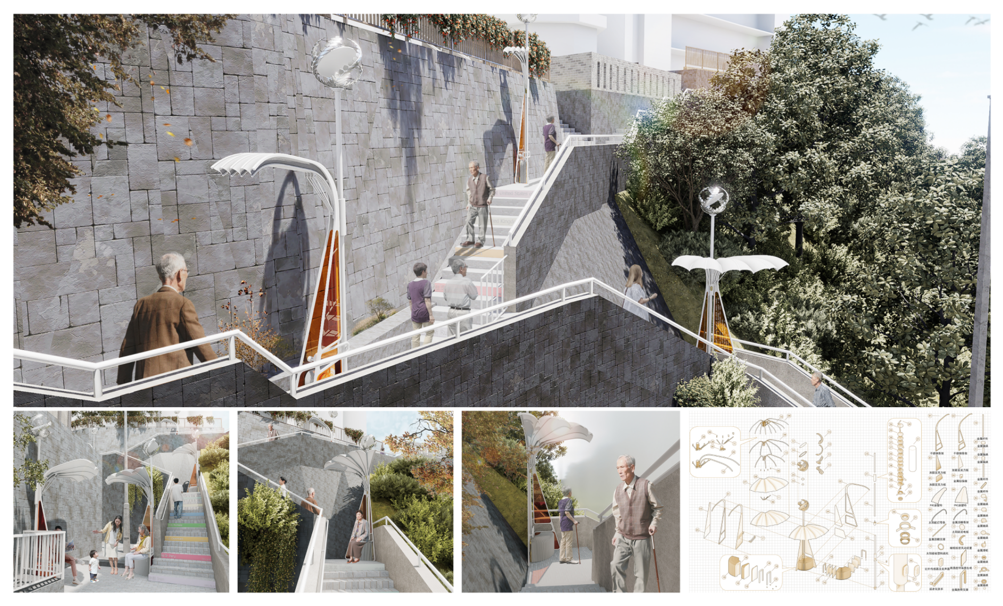 国际村社区历史悠久,平淡温馨的人生百态每天在此上演,留下了许多值得铭记的瞬间。本设计通过散点布置多个可短暂停歇的声景装置,来缝合原住老年居民与环境之间的矛盾。同时,该装置在空间维度下,植入了时间维度即国际村居民共同的声景记忆,以期能唤起居民的情感记忆与共鸣。设计最终目标是让老年人在乏味冗长的爬坡行为中保持身心愉悦,消解其对爬坡的消极情绪,重塑健康的城市心理感受。