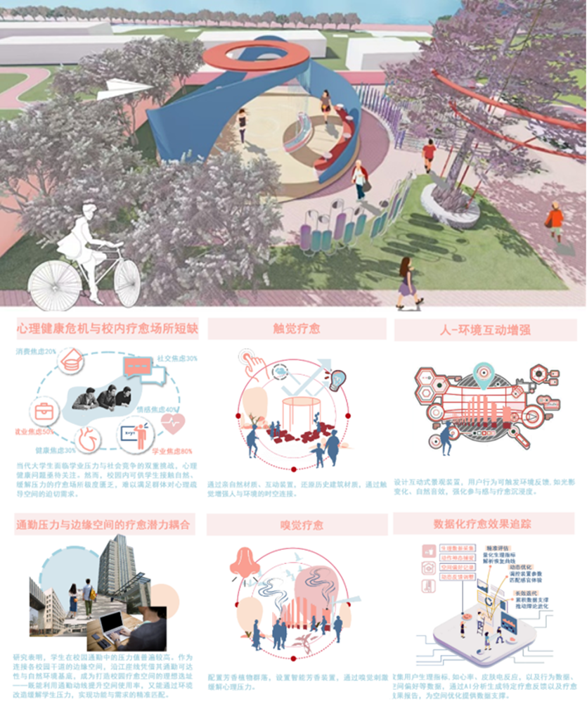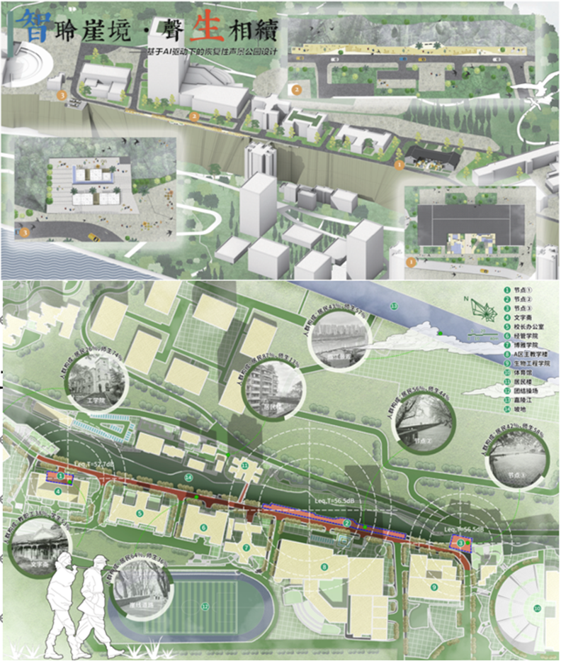 本方案针对重庆大学A区崖线临江区域交通噪声干扰与空间舒适度不足的问题,提出“AI驱动下的智能声景疗愈策略”,以声景愈疗、历史重构与智能交互为核心理念。设计融合AI情绪识别、行人追踪与声学掩蔽等技术,构建集降噪、文化激活与心理调适于一体的智能互动系统。空间围绕“人智共生、文脉共生、合鸣共生、澄江共生”四大节点展开,结合声光互动、历史音效与冥想装置,打造兼具科技感与人文关怀的校园疗愈声景公园。