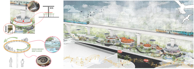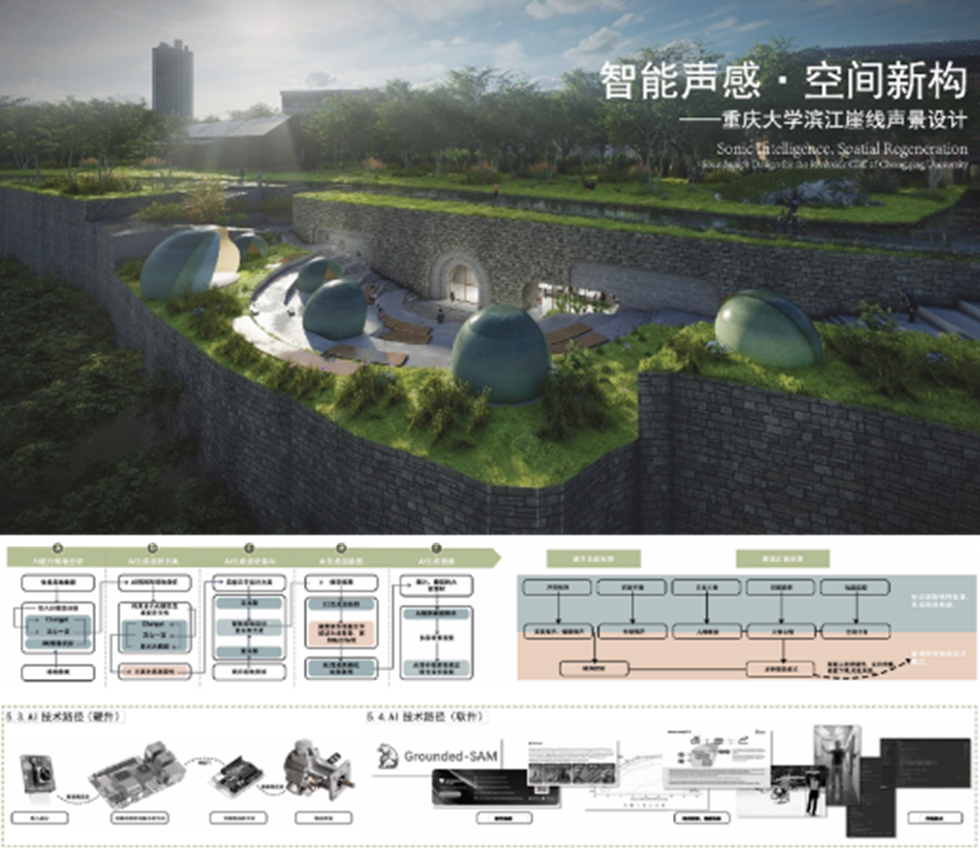 本方案选址于重庆大学崖线沿线,处于百年历史建筑与自然江岸之间,聚焦文化感知、生态体验与智能互动的整合设计。项目围绕“声赋文脉、声能唤场、人声共融、智感共声”四重主题,融合手势识别、压力感应与情绪识别等多模态AI技术,打造智能响应的交互式声景系统。设计通过声光联动与实时数据反馈,重塑人—场所—声音的动态关系,实现对场地文化记忆的唤醒、生态品质的优化与公共空间的智能化更新,为高校历史与自然复合场景中的声景转型提供可行路径。