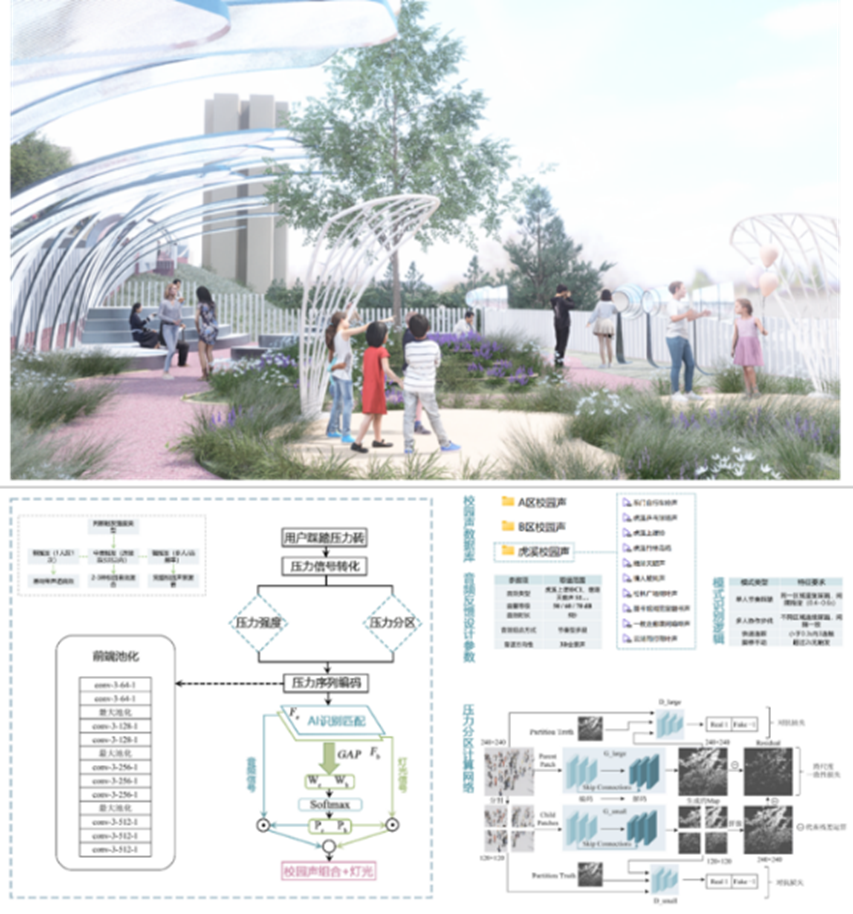 本设计聚焦重庆大学A区崖线节点,以“涟漪”为意象切入,表达“感官扰动引发情绪共鸣”的设计逻辑,构建多维互动的声景体验场所。空间结构依循“嗅听—触听—视听—放空”的感知路径,营造递进式的情绪转换与行为引导节奏。装置系统整合AI行为识别、情绪感知与多模态环境反馈(声、光、嗅、触),实现“个体触发—场所回应—氛围生成”的智能闭环。设计通过局部扰动引发整体共鸣,展现环境对情绪的柔性适配能力,并探索情绪体验如何深度嵌入校园场地的日常互动中。