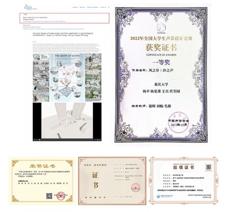 自2020年起,重庆大学谢辉教授团队开设全国首个研究生“声景设计”专项课程,六年来持续开展跨学科教学实践,依托3项省部级教改项目,指导学生在多类型场地完成声景设计,累计获国内外设计竞赛奖项20余项,包括美国声学学会国际设计竞赛金奖(全球仅2所高校获奖)、“Healthy Building Asia”最佳设计奖2项、“全国大学生声景设计竞赛”一等奖3项等。团队自主研发的“聆景”“声景云”等平台,获重庆市优秀工程勘察设计一等奖,其中“声景云”支撑学生完成全国26省769处场地调研,《声景设计虚拟仿真实验》课程入选重庆市一流本科课程,累计服务学生4380人次。