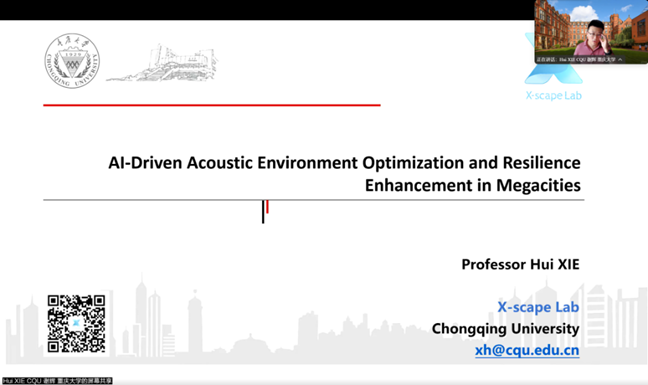 随后,中乌双方六位专家分别作学术报告。重庆大学谢辉教授以《AI驱动超大城市声环境优化与韧性提升》为题,结合正在进行的十四五重点研发课题,介绍了中国城市在噪声污染治理中的AI应用进展,包括噪声监测、健康风险评估与社区治理优化等内容,展示了基于城市环境大数据的智能决策平台建设。