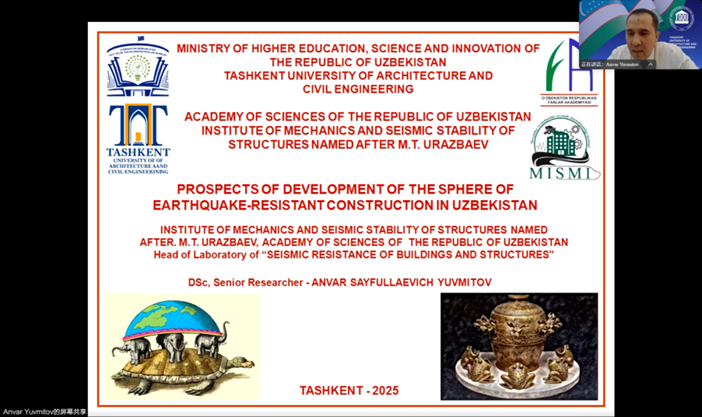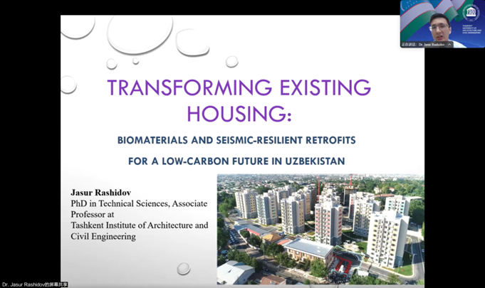 Rashidov副教授以《既有住宅改造:面向低碳的生物材料与抗震韧性技术》为题,分析了乌国建筑能耗与安全现状,提出通过国际合作开展绿色改造与技术提升,推动低碳韧性建筑更新。