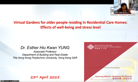 香港理工大学容晓君副教授分享了《虚拟花园对养老院老年人幸福感与压力水平的影响》,介绍了其团队研发的沉浸式虚拟自然场景对老年人心理健康的积极效应,未来将引入机器学习技术优化干预策略。