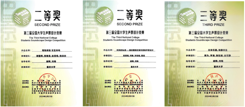 指导12名学生获中国声学学会主办的第三届“全国大学生声景设计竞赛”二等奖2项、三等奖1项。