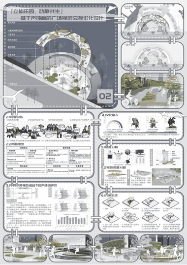 设计灵感源于半月形状,水幕投影展示本地特色忠义文化的三位将军故事。设置噪声实时监测系统,用于控制水幕和投影,实现水资源循环利用。针对场地高差,采用折叠理论引入二层平台,结合水幕声掩蔽,融入文化元素进行视听交互,并引入多种声音掩蔽装置和设施,实现人、环境、声音三者和谐相处的全新社区。