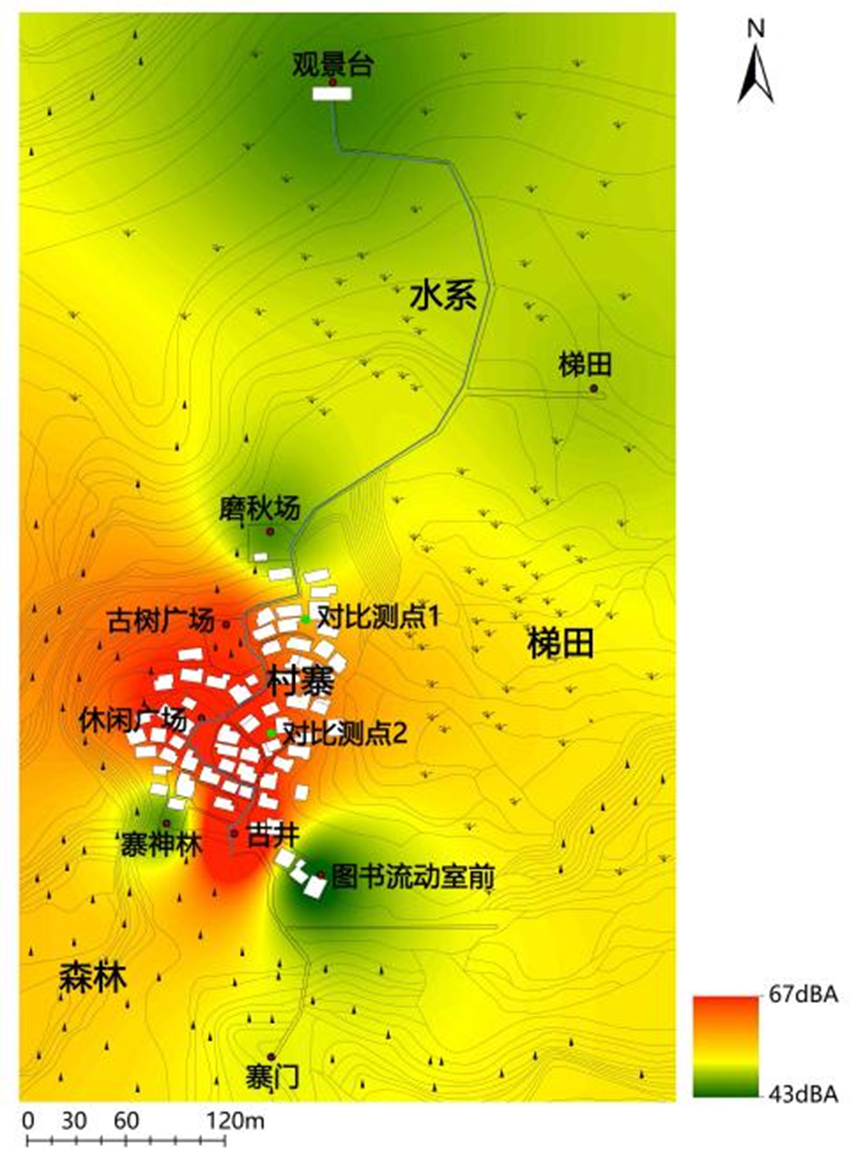 从哈尼四素的分区来看,村落内部LAeq均大于50dBA,由村寨主体向外的南部和西部以森林为主,北部和东部以梯田为主,这2类空间面积广阔,环境安静自然,LAeq均小于50dBA(图2、3)。