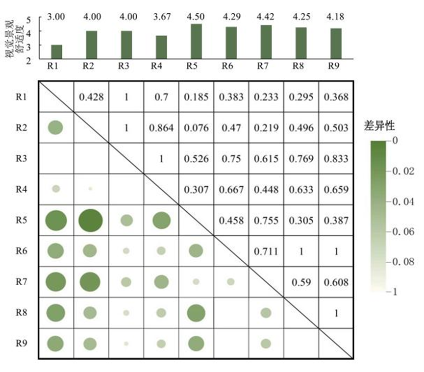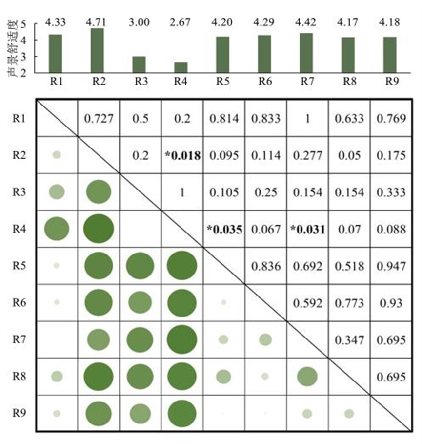 在视觉上,游客更喜欢开阔的自然空间,特别是有稻禽鱼虫等生物,视觉效果更丰富的梯田空间(图6)。个测点视觉景观舒适度差异性不大(图7),但从声景舒适度来看,R4(休闲广场)与3个测点存在显著差异,分别是R2(寨门)、R5(古树广场)和R7(观景台)。具有3种属性的寨门舒适度最高,是因为寨门掩映在森林中,符合游客对旅游地自然宁静的期待,来往居民的方言、传统服饰和寨门独特的造型传递出文化的特质和生活氛围,引起了游客的文化共鸣,满足了游客对旅游地的情感及感官需求。