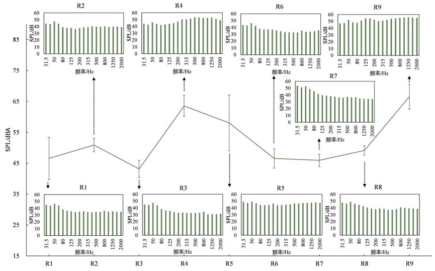 客观测试:测试内容包括等效A声级(LAeq)和1/3倍频程声压级,同时标记测点的地理信息。测点涵盖了森林(R1寨神林)、村寨(R2寨门、R3图书流动室前、R4休闲广场、R5古树广场、R6磨秋场、R7观景台)、梯田(R8梯田)、水系(R9古井)(图1)。