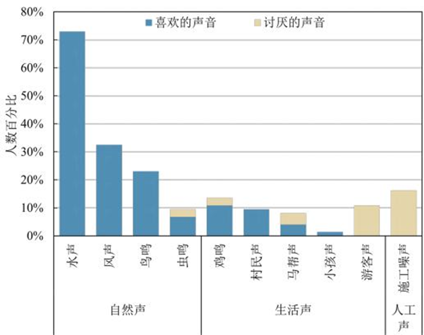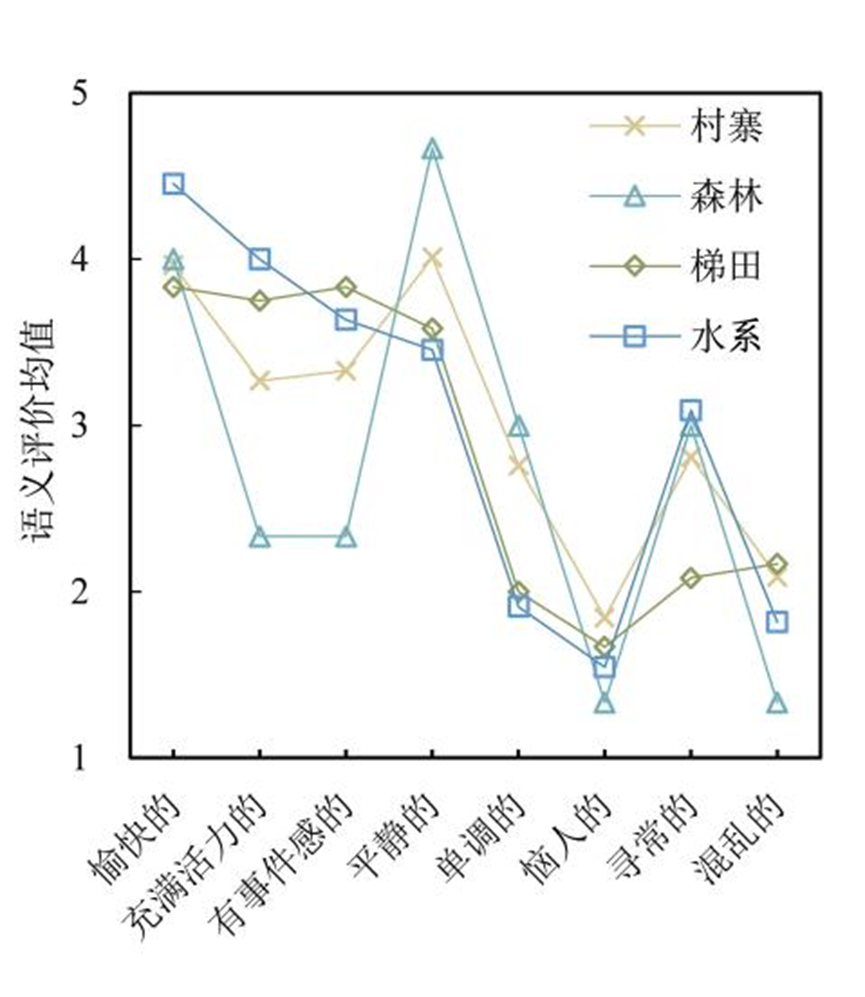 在各类声音中,游客偏向于喜欢具有自然属性的森林、水系和梯田空间中的声音(图4)。水系的声音以流水声为主,LAeq最大,但仍受到游客喜爱,这说明声喜好与声音类型相关。四素的语义评价中,梯田和水系的评价结果最好,其中哈尼族传统的稻禽鱼生态系统给梯田增添了活力,潺潺水流给村落带来不息的生命力,二者可以给游客提供更高的情绪价值(图5)。