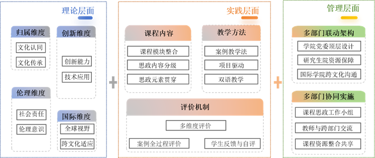 课程思政建设是一项系统工程,研究团队提出面向建筑类留学生教育的多维度课程思政体系,涵盖理论、实践与管理三个层面。