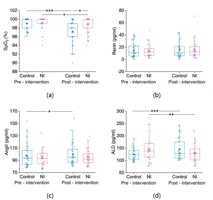 图8. 自然声干预前后OR患者的血液指标:血氧饱和度 (a)、肾素活性 (b)、血管紧张素II (c)、醛固酮 (d)(*p < 0.05,**p < 0.01,***p < 0.001)。