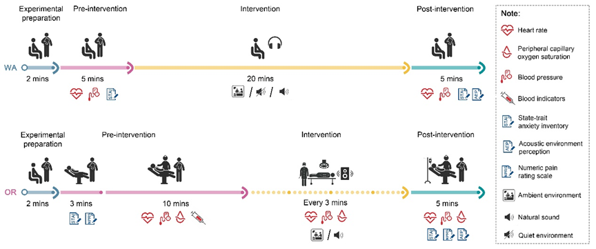冠心病(CHD)是临床上呈现高发病率和死亡率的心血管疾病,已成为一个全球性的重大健康问题。介入治疗室的噪声会对患者产生负面情绪和不良的生理反馈。聆听自然声作为一种非药物干预方法,对患者具有主观感知、心理和生理三方面的恢复效应。然而,自然声干预对介入治疗室中WA和OR患者在术前、术中及术后的主观感知、心理和生理指标的直接效益及其相关机制情况尚未明确。此外,由于介入治疗室的等待区(WA)和手术区(OR)患者由于所处治疗状态的不同,其在生理和心理上也可能存在差异。本研究尝试将自然声作为辅助治疗措施加入到介入治疗过程中,对比现有噪声条件下和自然声干预条件下,介入治疗室WA和OR的患者在术前、术中及术后主观、心理与生理指标的变化,由此探索自然声对患者的恢复性效益与作用机理。