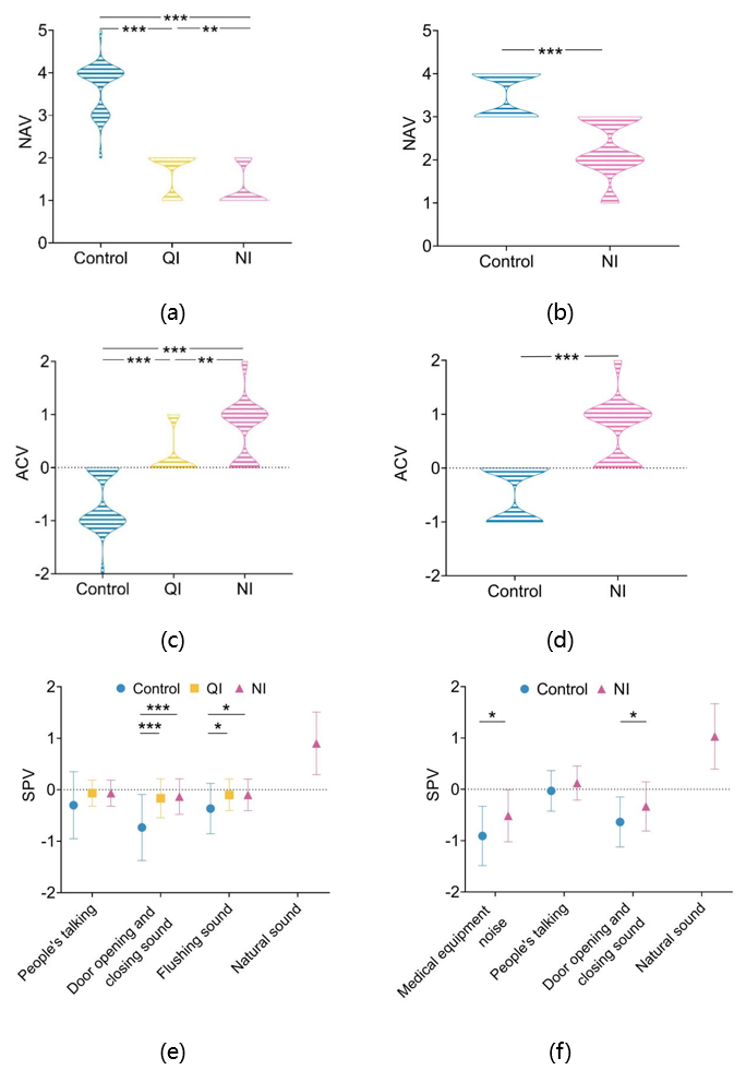 图 4. 自然声干预后 WA 和 OR 患者的声环境感知评估:WA 的 NAV(a),OR 的 NAV(b),WA 的 ACV(c),OR 的 ACV(d),WA 的 SPV(e),OR 的 SPV(f)(p < 0.05,* p < 0.01,*** p < 0.001)。