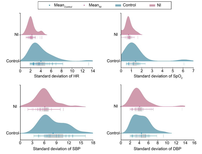 自然声干预对患者术中HR、SpO2和收缩压SBP有显著影响,但对DBP无显著影响。在整个干预过程中,HR显著下降。此外,四项生理指标的术中波动均小于对照组,波动幅度由大到小依次为:SBP(47.9%)> HR(43.5%)>SpO2(25.2%)> DBP(9.1%)(图9)。