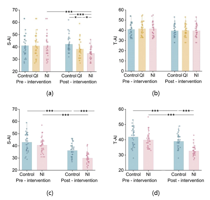 图 6. 自然声干预前后患者的STAI结果:WA 的S-AI得分(a),WA 的T-AI得分(b),OR 的S-AI得分(c),OR 的T-AI得分(d)(*p < 0.05, ** p < 0.01, *** p < 0.001).