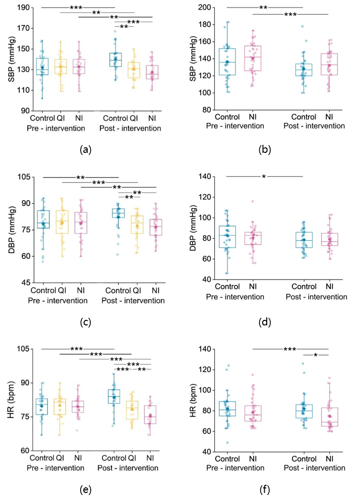 生理指标:在自然声干预后,与基线相比,等待区的 QI 组和 NI 组患者的SBP、DBP和HR显著下降,尤其是 NI 组,而对照组患者则显著上升。手术区两个组的HR和SBP均低于基线值,NI 组的下降更为明显(图7)。